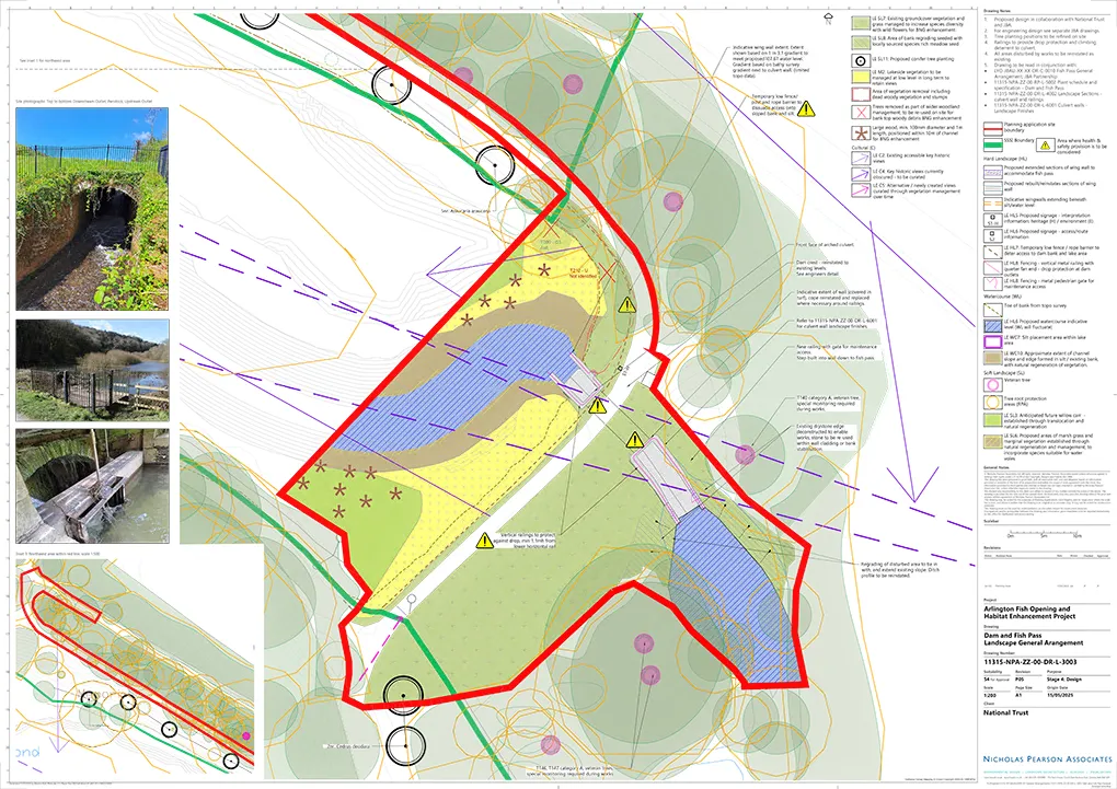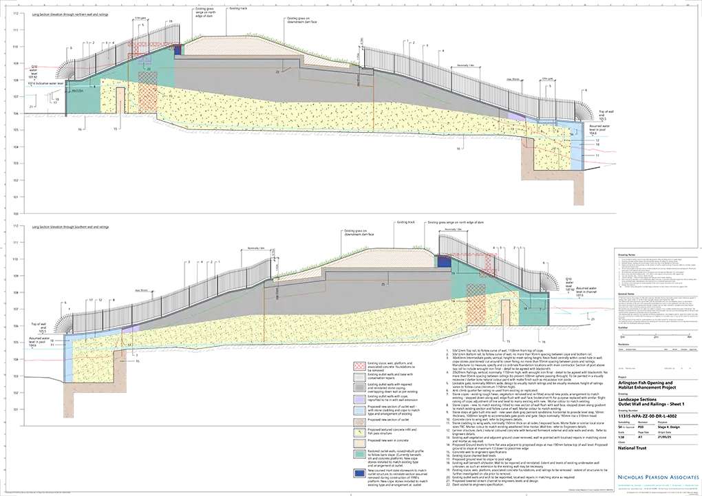 National Trust needed to adapt the historic lake and dam at Arlington to improve fish and eel passage whilst maintaining the ecological value of the River Yeo and the designed landscape. Nicholas Pearson Associates was commissioned to provide environmental design services, combining landscape design and visualisation, to help National Trust develop a coordinated proposal for planning. Our work focused on integrating a new fish and eel pass into the existing outlet structures so that it sat comfortably within the Grade II* registered historic landscape and the Arlington Site of Special Scientific Interest. The project required close coordination with engineers and heritage consultants through RIBA Stages 2 and 3 for planning.